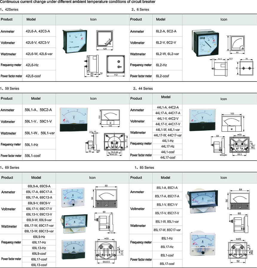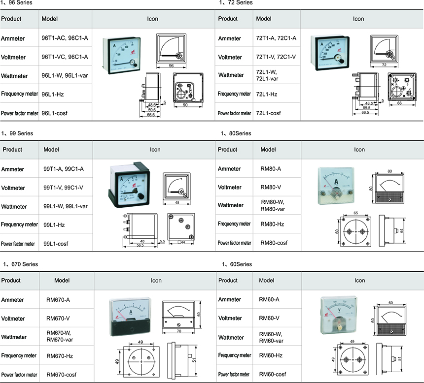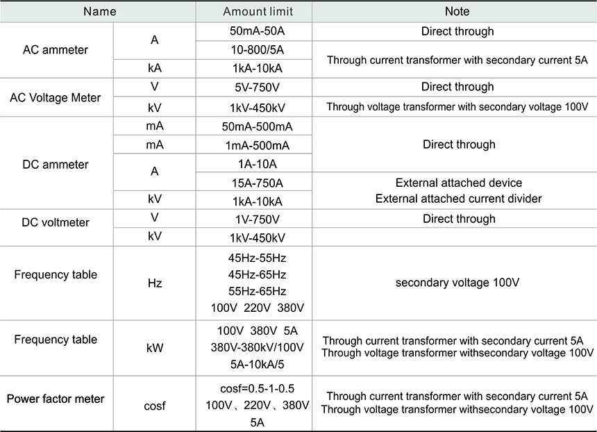 Mounting type electric meter is a direct acting indicating analogue electrical-measuring instrument with wide application range, it is applicable for measurement of DC circuits and power frequency AC circuits: electric parameters such as voltage, current, frequency, power factor, synchronous indication, etc. Intrinsic advantages of mounting panel meter: display the change trend of measured electric quantity, in addition to single use, it is mainly matched with instrument board for various HV and LV switch gears, power cabinets, control cabinets as well as various electrical control devices, its the indexes are in accordance with the technical requirements of national standard GB/T7676-1998.