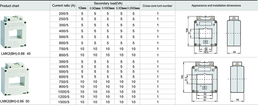 LMK2(BH) - 0.66 type current transformer is mainly used for indoor, for rated voltage up to and including 0.66 kV, rated frequency 50Hz ac circuit as the electric current and electric energy measurement and relay protection. Product is a plastic shell type current transformer, are widely used in the complete sets of cabinet put oneself in another's position, its installation method can be used bus fixed and base plate fixed installation method, suitable for any direction installation, a conductor for bus or cable.