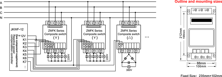 This switch is installed at the 380V three-phase four-wire distribution network, to control the making and breaking operation of low-voltage reactive power compensation?capacitor. User can install it in the low-voltage reactive compensation capacitor box, box type transformer or other proper positions. In general, it adopts the hung-type?installation, please refer to the following outline dimensions.