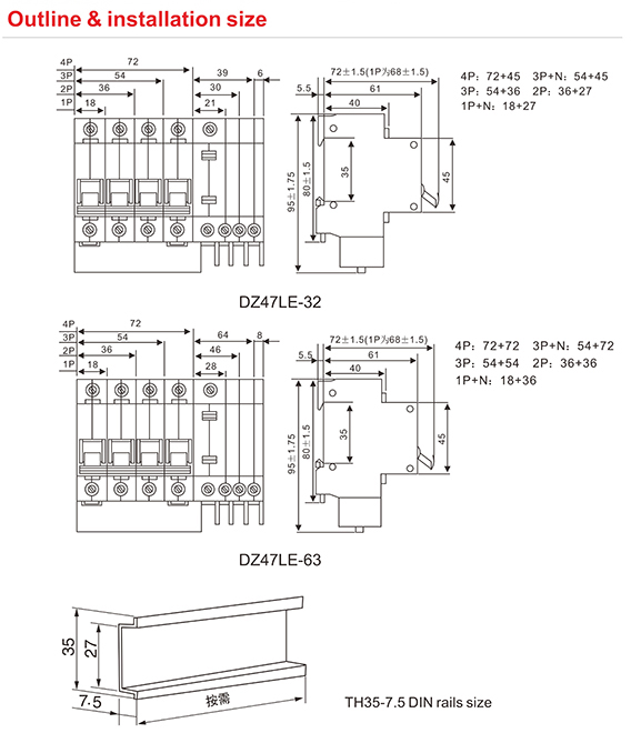The DZ47LE residual current operated circuit breaker is applicable to the circuit with an alternating current of 50Hz, rated-voltage single pole and two lines/two poles 230V, three poles/three poles and four lines/four poles 400V, and a rated current up to 63A; when the human body gets an electric shock or thenetworkleakcurrent exceeds the specified value, the residual current operated circuit breaker can rapidly cut off the power supply in trouble within a very short time for the safety of the human body and the powered equipment. With the function of overload and short circuit protection, the residual current operated circuit breaker can be used to protect the circuit or motor from being damaged by overload and short circuit, and can also be used for not–frequent operational transformation in the circuit under normal condition.The product meets the standards of IEC 61009-1.