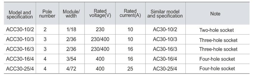 ACC30 series module socket, multi-functionalsockets are operating in the load circuit of voltage230/400V, AC50/60Hz, current up to 25A, coop-erated with termination device, widely for highbuildings, mineral enterprises, station, port,hospital, commercial building, test lab and livingapartment and etc.Executed standard: single phase socket: GB1002, Three-phase socket Gb1003