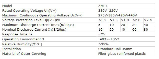 ZMP4 series surge protective device (SPD) is suitable for TN-S、TN-C-S、TT、IT etc. Power supply system of AC 50/60Hz, ≤380V, which protects the electric device not shocked by the thunder or surge over-voltage.