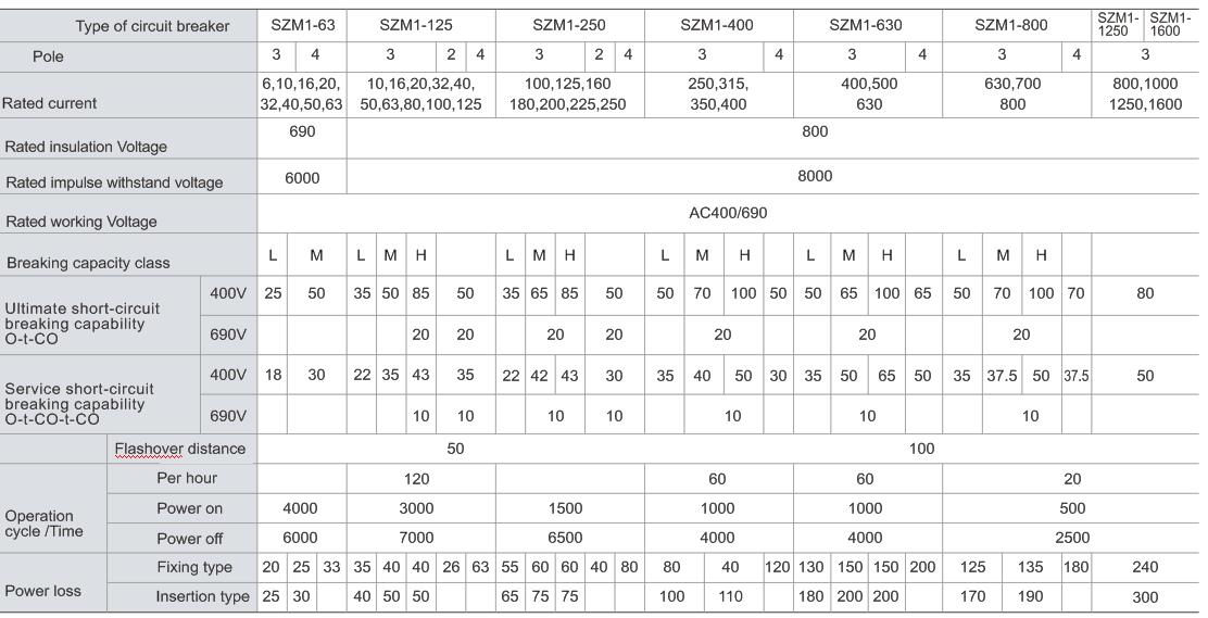 SZM1 series molded case circuit breaker (hereinafter referred to as circuit breaker) is suitable for distributingnetwork of AC 50Hz (or 60Hz), rated insulation voltage690V, rated working voltage 690V or below and ratedcurrent 1250A or below. It can be used to distributeelectric energy and protect the circuit and electricequipment against overload, short circuit and undervoltage, furthermore, the circuit breakers of framesize 400A below also can protect the motor againstoverload, under voltage and short circuit. Undernormal condition, the circuit breaker also can be usedto switch the circuit and start the motor infrequently. The products are in conformity with such standards as IEC 60947-2 and GB 14048.2.