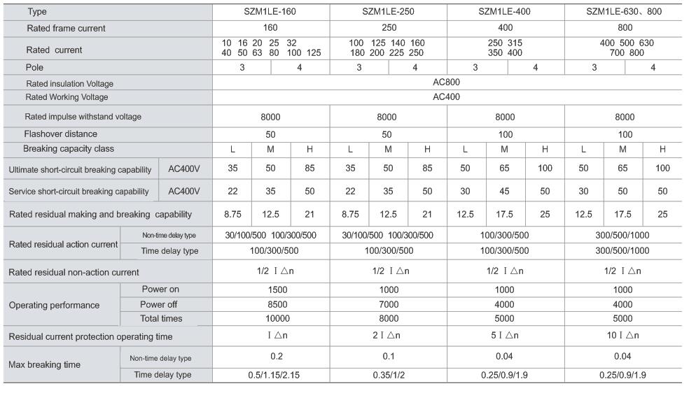 SZM1LE series residual current circuit breaker(hereinafter referred to as circuit breaker) is suitablefor distributing network ofAC50Hz,ratedvoltage400V,ratedcurrent 800A, to make indirect contactprotection to the human being, also to prevent fireaccident caused by ground fault current due to thedamage of insulation of equipment. In addition, it notonly can be used to distribute electric energy and protect the circuit and power equipment against overload and short circuit, but also can be used to switch the circuit or start the motor infrequently. The sampling operational power supply of leakage protec-tion module of common residual current circuitbreakers is two phases, but this series of circuitbreakers is three phases, and if any one of threephases is lack, this circuit breaker leakage protectionmodule can still work normally. The rated residualoperation current and max breaking time may beadjusted according to practical situations.
