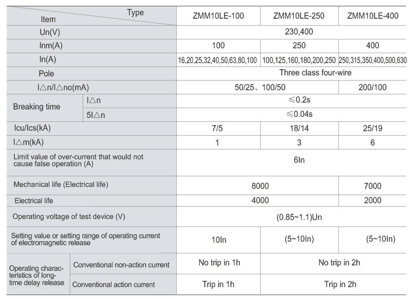ZMM10LE series leakage circuit breaker is suitablefor circuit of AC 50Hz, rated working voltage 400V,rated current 400A, it can be used to protect the line equipment and human being from getting an electricshock. In addition, it not only can protect the circuitand power equipment against overload and shortcircuit, but also can be used to infrequently switchthe circuit.