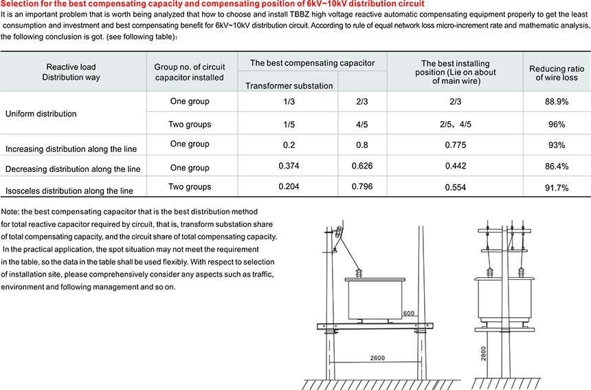 TBBZ high voltage reactive power automatic compensating equipment (hereinafter referred to as equipment) is suitable for 10KV and 6KV distribution circuit, installed on the overhead circuit, to improve power factor, reduce circuit consumption, save electric energy and improve the voltage quality, besides, it is also used for reactive compensating of 10KV busbar of miniature terminal transformer substation and compensating high voltage motor on the spot.