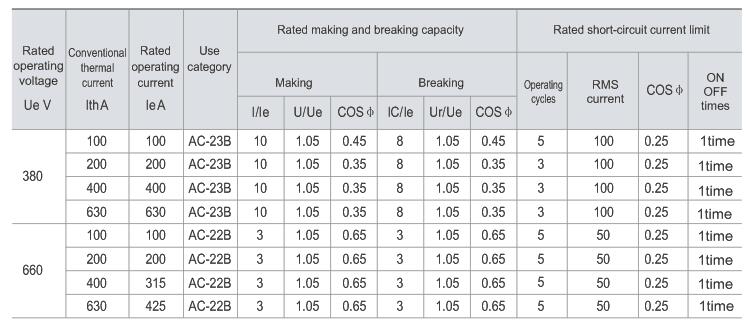 Rated working current: 380V: 100A, 200A, 400A, 630A;