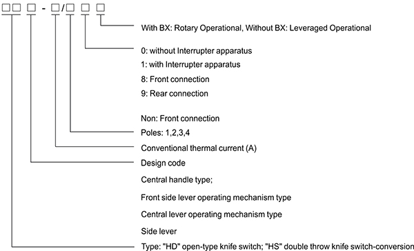 HD knife switch and knife-shaped transfer switch (hereinafter referred to as the switch) ?is applicable for the complete set of distribution unit with the AC frequency of 50Hz, rated current up to 380V and the rated current up to 3000A, to turn on and off the AC and DC circuit in an infrequent manner or serve as isolation switch
