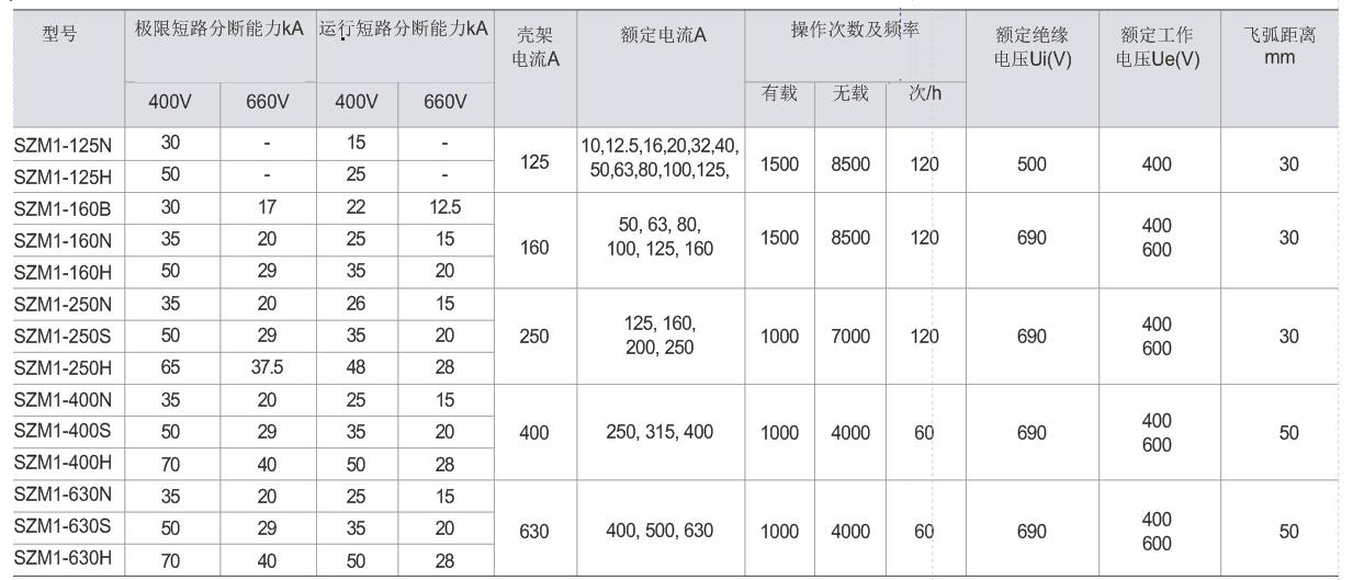 SZM1(NS)系列電子式塑料外殼式斷路器適用于交流50Hz,額定電流從10A至630A,額定絕緣電壓為690V(Inm=125A的為550V),額定工作電壓660V(Inm=125A的為400V)及以下的電路中,在配電網(wǎng)絡(luò)中分配電能及作為線路和電氣設(shè)備的過載,短路保護(hù)之用,在正常情況下斷路器也可作為線路的不頻繁轉(zhuǎn)換之用,殼架等級電流400A及以下的斷路器亦可作為保護(hù)電動(dòng)機(jī)的不頻繁起動(dòng)之用。