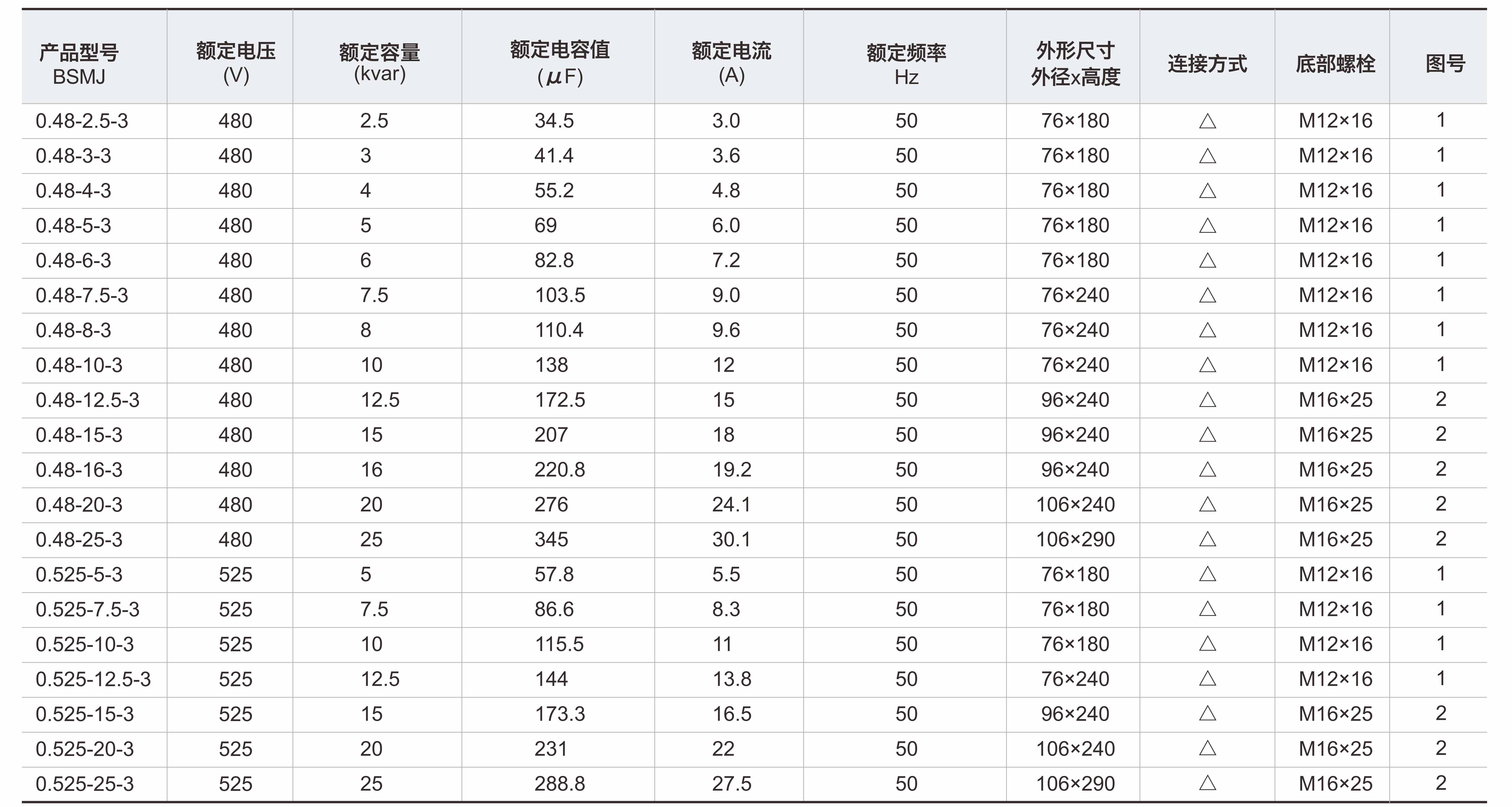 采用圓柱形鋁罐封裝。浸漬劑為無公害絕緣油。置壓力分離裝置及放電電阻。電容芯子采用自愈式優(yōu)質(zhì)金屬化聚丙烯薄膜。電容器頂部為防觸電接線端子。電容器底部為M12或M16安裝及接地螺栓。三相電容器內(nèi)部均為△接法。
