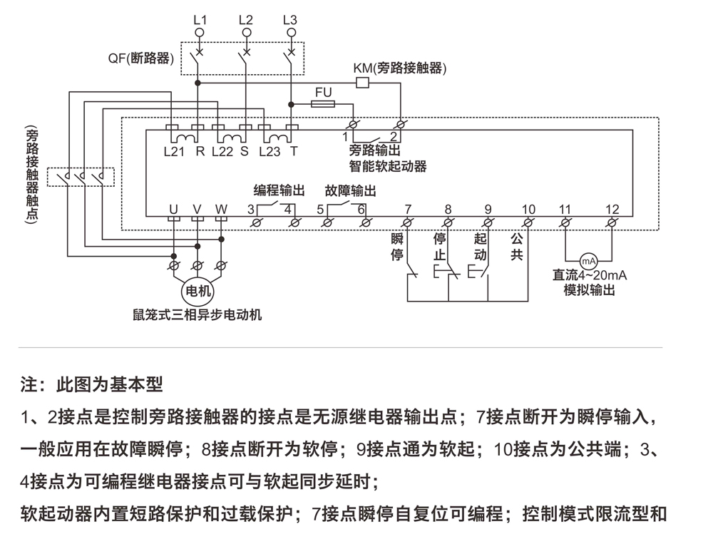 適用電機(jī):鼠籠式三相異步電動(dòng)機(jī),電機(jī)額定功率應(yīng)與軟起動(dòng)柜額定功率相符或以下。
