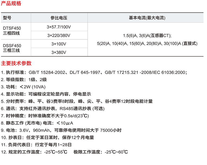 DTSF450、DSSF450系列三相四線、三相三線電子式多費率電能表用于測量三相四線和三相三線的有功電能,它采用最新微處理器技術(shù)和高精度寬量程數(shù)字化電能計量芯片,設(shè)計具有高精度、寬量程、穩(wěn)定性高、低功耗。結(jié)構(gòu)端莊穩(wěn)重,采用專用LCD顯示,以及軍用元器件生產(chǎn),從而電能表使用壽命長,免維護,抄表方便。該產(chǎn)品能正反向雙向計量,具有一定防止反接竊電能力,并提供脈沖輸出,方便用戶檢測,是國家推行分時電價政策的優(yōu)越產(chǎn)品。
